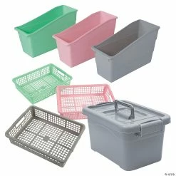 Tidy up your classroom or workspace with this convenient storage kit! Featuring an assortment of shapes and sizes in soft colors, these bins are great for storing craft supplies, stationery, folders, books and so much more. Use them to add a touch of style to your office or classroom while staying efficiently organized. Color-coordinate your space with more storage supplies and accessories on this website! (15 pcs. per unit) Assortment may vary.Includes:โข 3 Plastic Grey Locking Storage Bins with Lid & Handle (6 1/4″ x 11 1/4″ x 7 1/4″)โข 6 Plastic Pastel Classroom Book Bins (5″ x 12 1/2″ x 7 1/4″)โข 6 Plastic Soft Color Classroom Storage Baskets with Handles (13″ x 9 3/4″ x 3″)