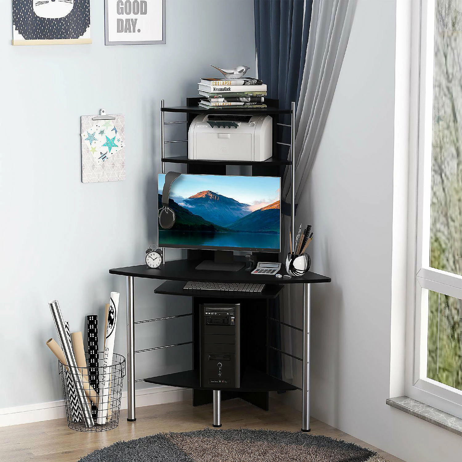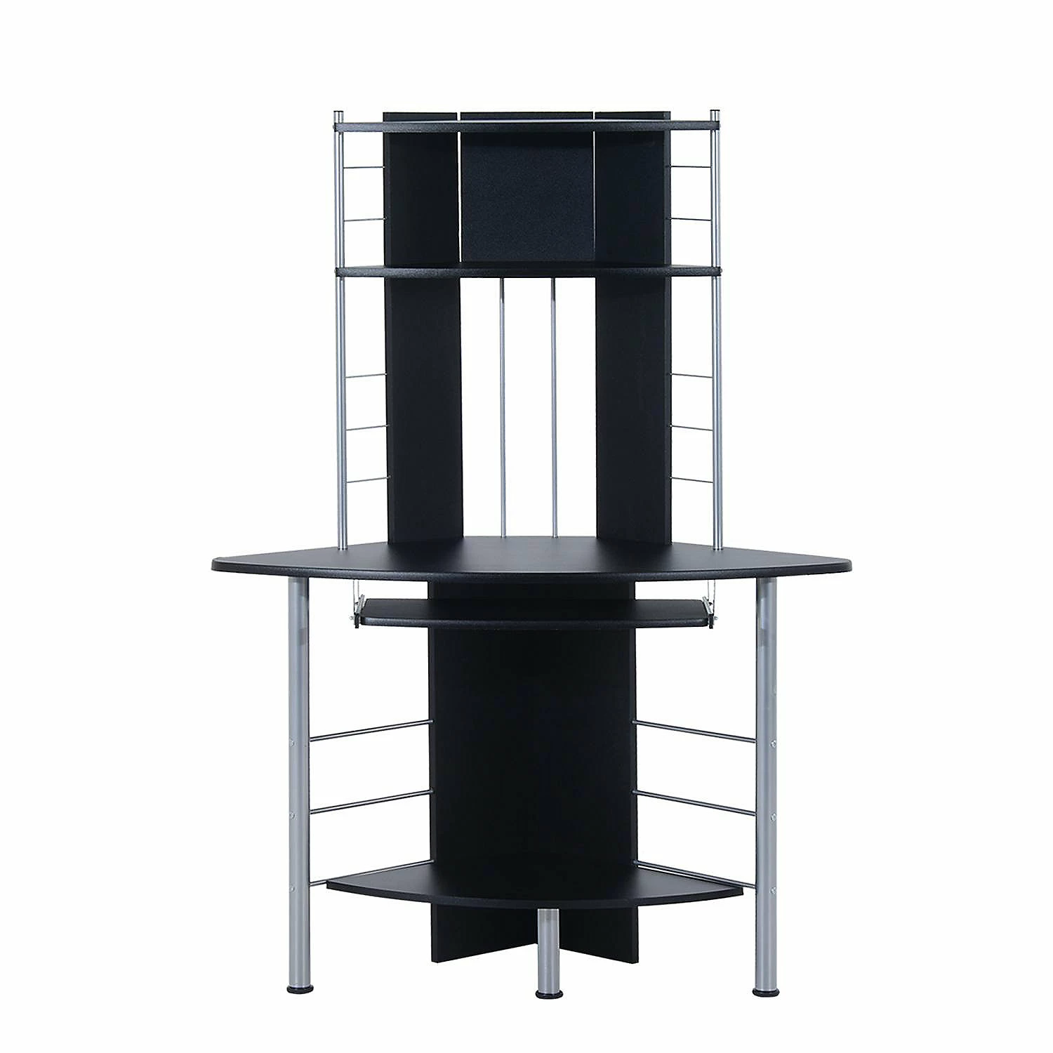 This accommodating compact arch tower modern home office desk from HOMCOM offers an ideal storage solution. This computer desk with shelves provides everything you need including a dedicated compartment to hold your printer, pull out sliding keyboard, and an upper shelf. A mix of steel and engineered wood creates a sturdy office desk with storage to hold all your homework, work files, or gaming accessories that’ built to last while supporting up to 175 lbs. Features:- Sturdy and durable solid steel and CARB MDF board construction presents a stylish modern look – Compact design fits effortlessly in any corner of most rooms of the home or office – Features a keyboard tray shelf and printer platform hutch – Upper shelves can be used to display and store assorted items – Easy clean up and care, just wipe with a damp cloth to keep looking new – Anti-slip feet help keep the desk stable – Assembly requiredSpecifications:- Color: Black – Material: Steel, P2 grade MDF – Overall Dimensions: 44.5″ L x 25.5″ W x 62.25″ H – Table Surface: 44.5″ L x 25.5″ W – Tabletop to Floor: 30″ – Host Platform: 20.5″ L x 20.5″ W – Host Platform to Floor: 7″ H – Printer Platform: 28.75″ L x 11.75″ W x 10″ H – Printer Platform to Tabletop: 20.5″ – Keyboard Shelf: 23.75″ L x 11.75″ W – Weight Capacity: 175 lbs – Net Weight: 59.5 lbs