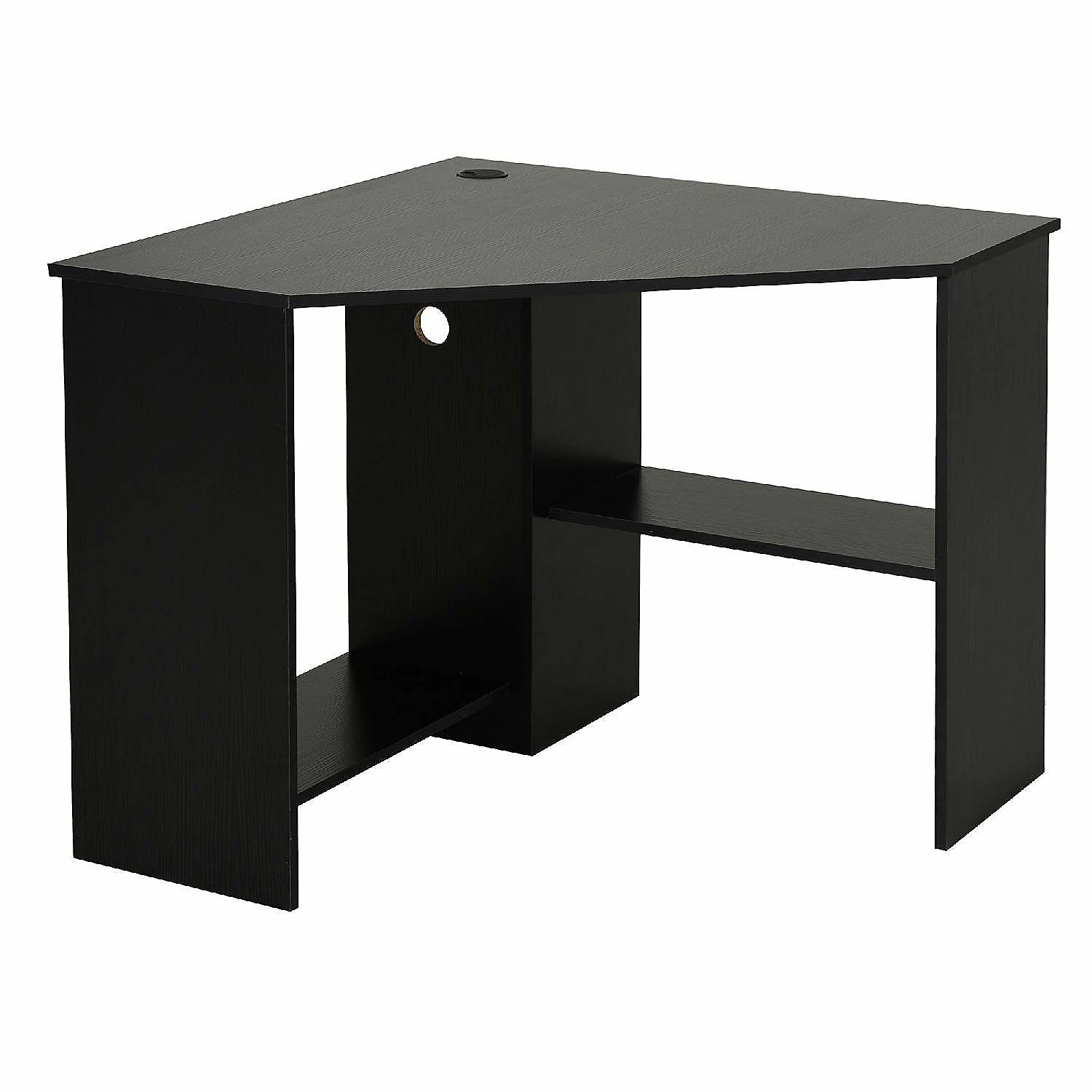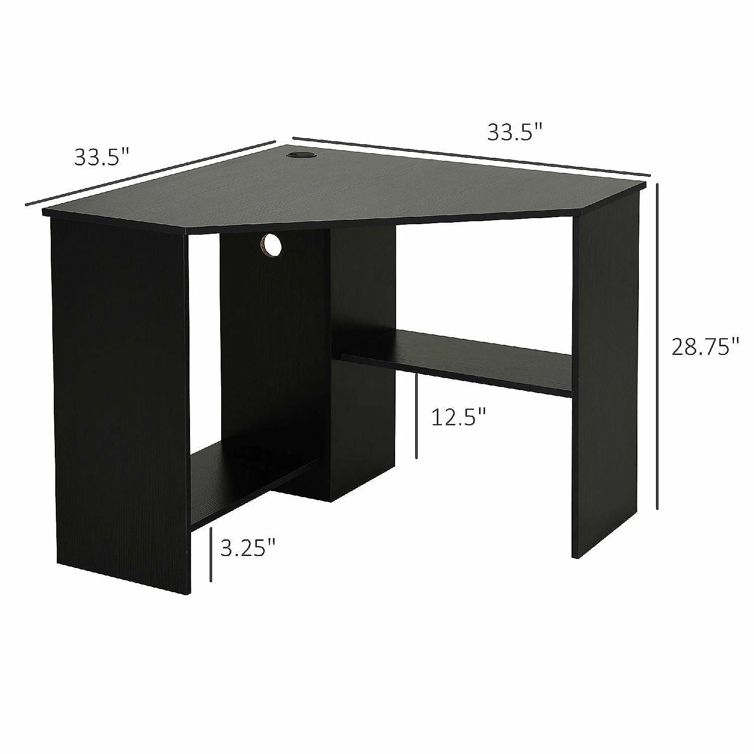 The multi-tier corner computer desk from HOMCOM comes with 2 storage shelves. It is designed for organizations and keep items neat and tidy, giving you ample space to hold book, magazines, documents and more. Equipped with cable management to keep your cables in order. This desk is both stylish and functional for your study space, and can be used as a laptop workstation or writing desk, perfectly ideal for any home and decor.Features:- A designer with an inventive mind crafted the desk for you – Made from P2 class particle board, it’s a piece of furniture that you’ll cherish for many years – Equipped with cable management to keep your cables in order – 2 storage shelves offer more storage space – Three legs with triangle design create extra stability – Modern and elegant design, fit any home, studio,apartment and office – Easy to assemble and clean, Instructions Included – Assembly RequiredSpecifications:- Color: Black – Material: Particleboard – Overall Dimension: 33.5”L x 33.5”W x 28.75”H – Desktop Diagonal Length: 47.25” – Particleboard Thickness: 0.5” – Weight Capacity: 110lbs (total), 22lbs (each shelf)