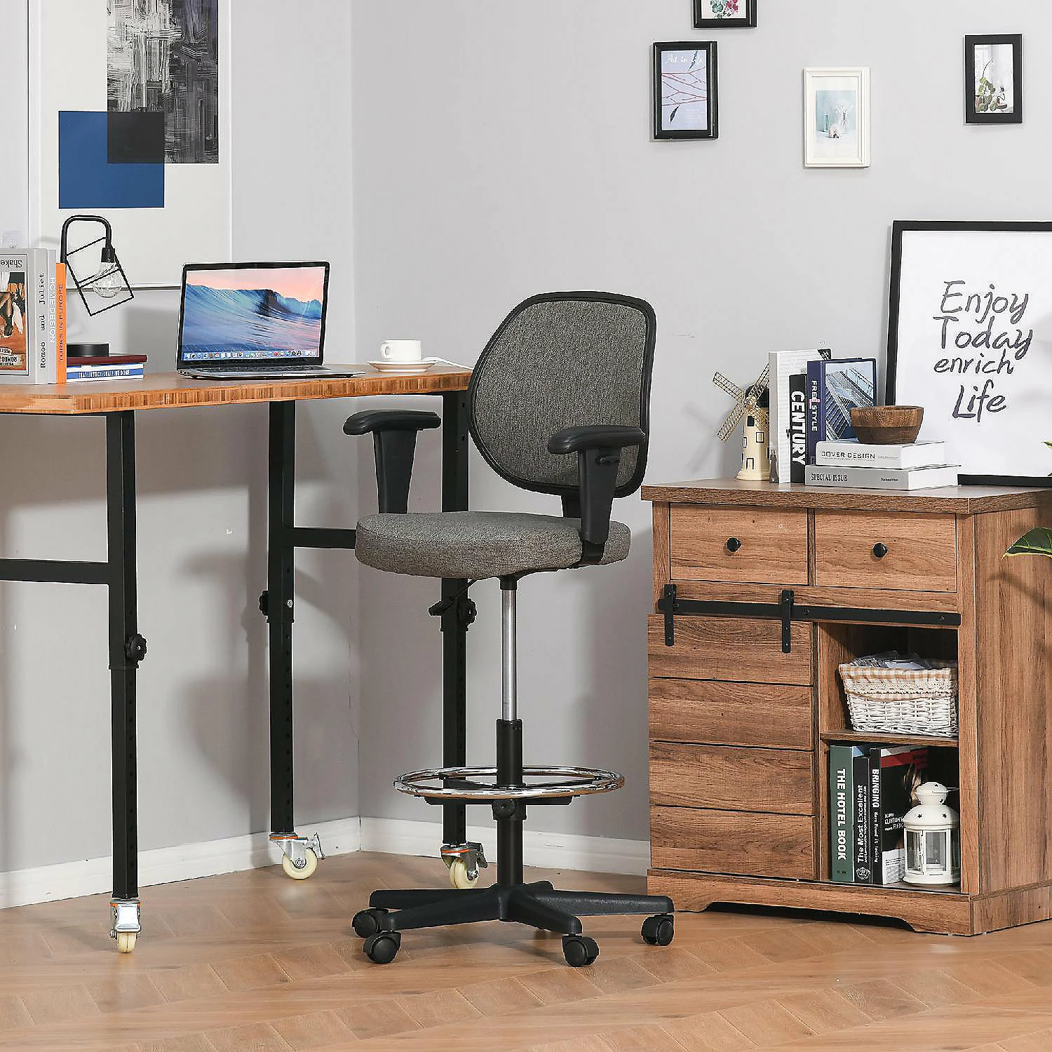 A quality office chair needs to be comfortable even after sitting for long periods of time. This drafting chair from Vinsetto can offer you the comfort you need while matching your office space. This comfort is achieved through the use of quality materials: soft fabric back, sturdy base casters. and a range of adjustments: seat height, armrest height, and footrest height to make sure it is the perfect fit. This drafting chair is here to help to ensure you do your best work.Features:- Adjustable drafting chair for tall standing tables; – Ergonomic line design with thick padding, provides extra comfort; – Soft fabric is skin-friendly and comfortable; – Adjustable seat height, foot ring height enable you to work in comfort during long periods of time; – Adjustable armrest height to match desk height or sitting style; – With the 360ยฐ swivels for easy rolling from place to place; – Build-in lumbar support also add chic styleSpecifications:- Color: Grey; – Material: Sponge, PVC, Steel, Polyester; – Overall Dimension: 25.5″ W x 20.75″ D x 42.5″-51.25″ H; – Seat Dimension: 19.25″ W x 18″ D x 25.5″-34.25″ H; – Armrest Height(to Seat): 8.25″-10.5″; – Back Size: 18″ W x 17.5″ H; – Foot Ring Height(to Ground): 7.75″-18.5″; – Max Load: 265lbs; – Item Label: 921-375V80