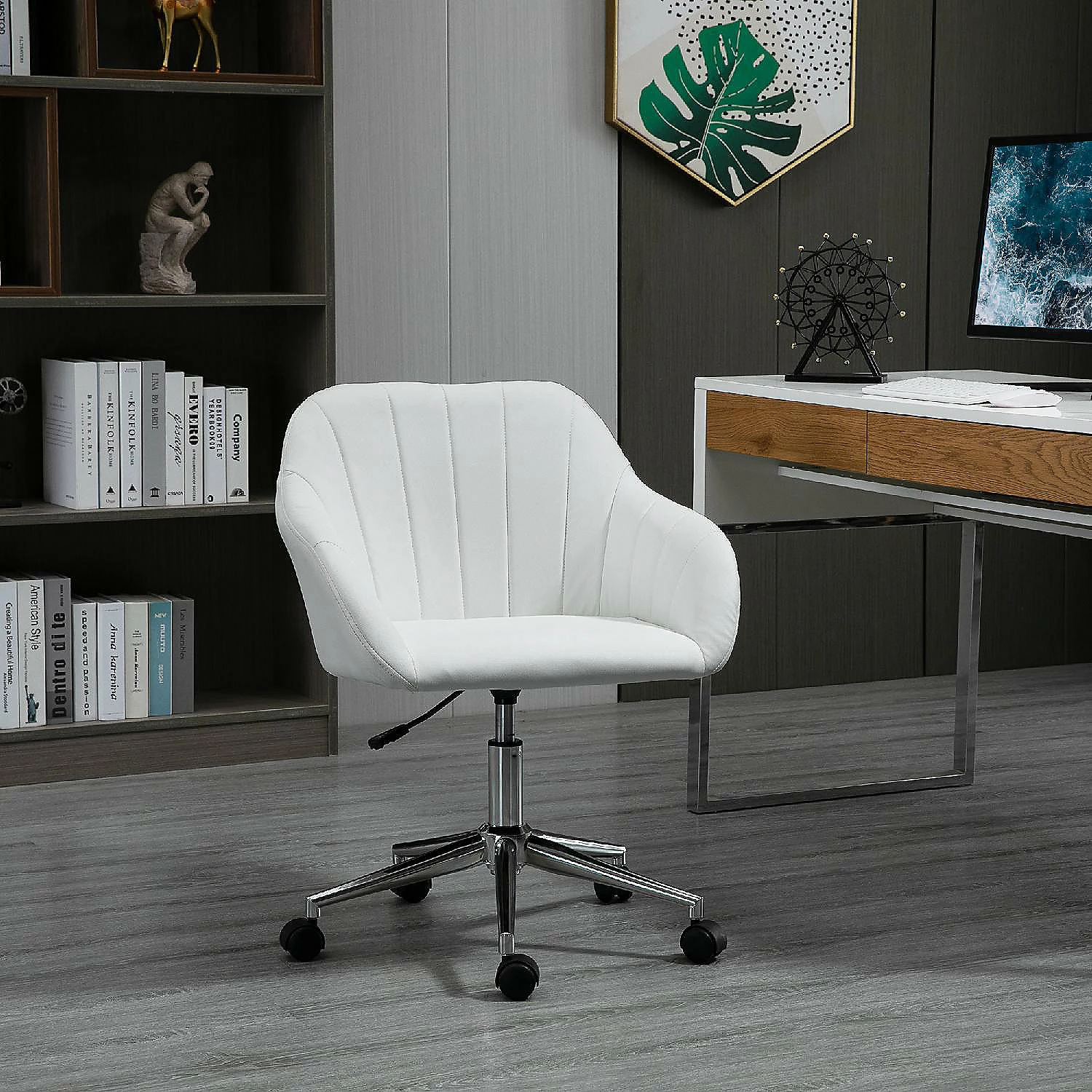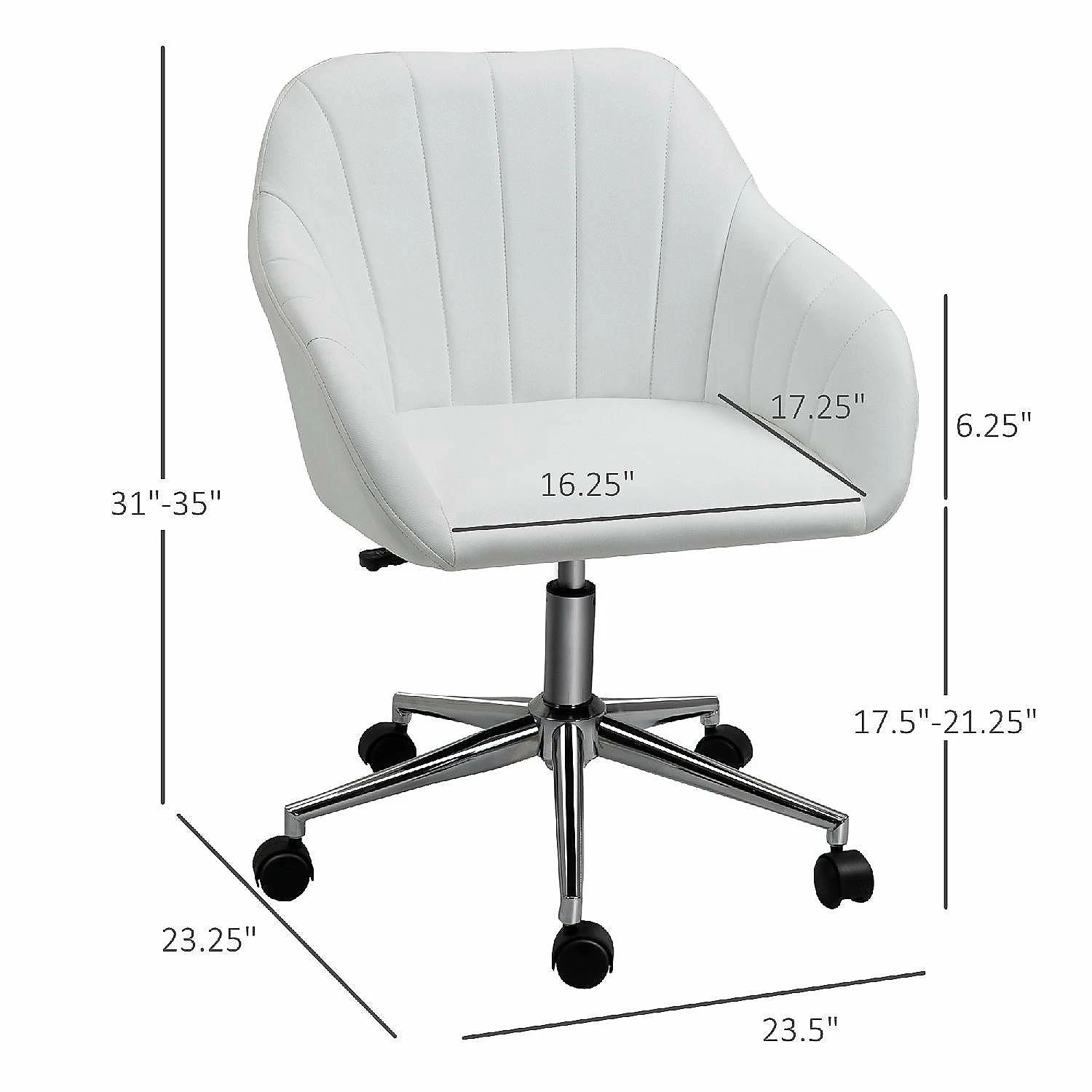 Add class and comfort to your home office with computer desk chairs from Vinsetto. This swivel armchair has a chic tub design with line faux leather stitching on the backrest to create a luxury atmosphere. Adjust the seat height of this PC chair to accommodate your desk and sitting style. Get around your office quickly with 360 degree swivel wheels. Relax in style and comfort with this accent leisure chair from VinsettoFeatures:- Ergonomic line design with thick padding seat, provides extra comfort;